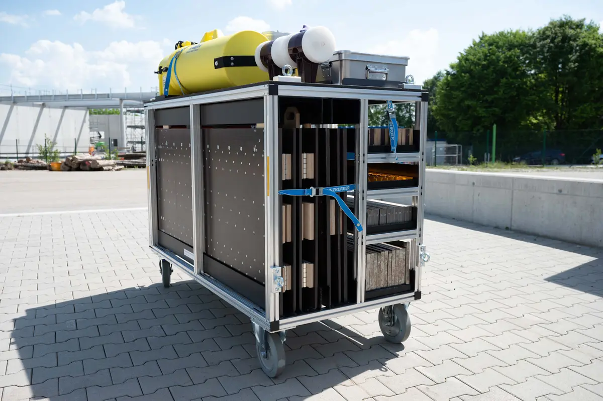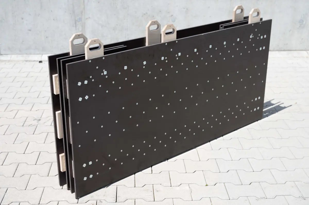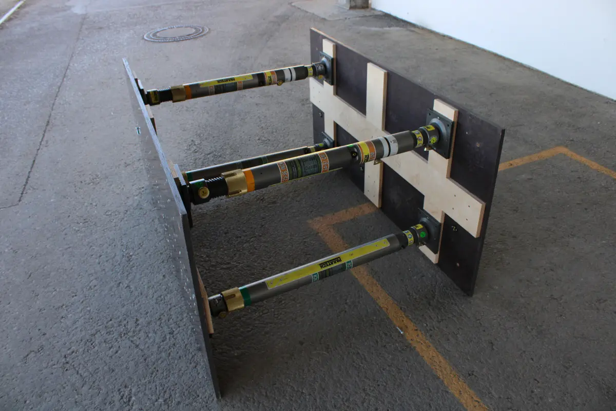 - 2x Seitenwände (1600x750x36mm) aus 18mm Siebdruckplatten, verstärkt durch 18mm Multiplex Buche, verschraubt und verleimt, geeignet zum Einsatz als Tiefbau-Rettungstafeln