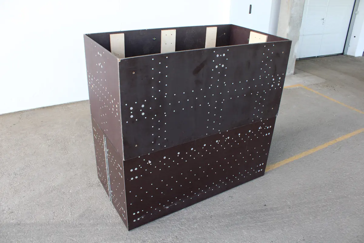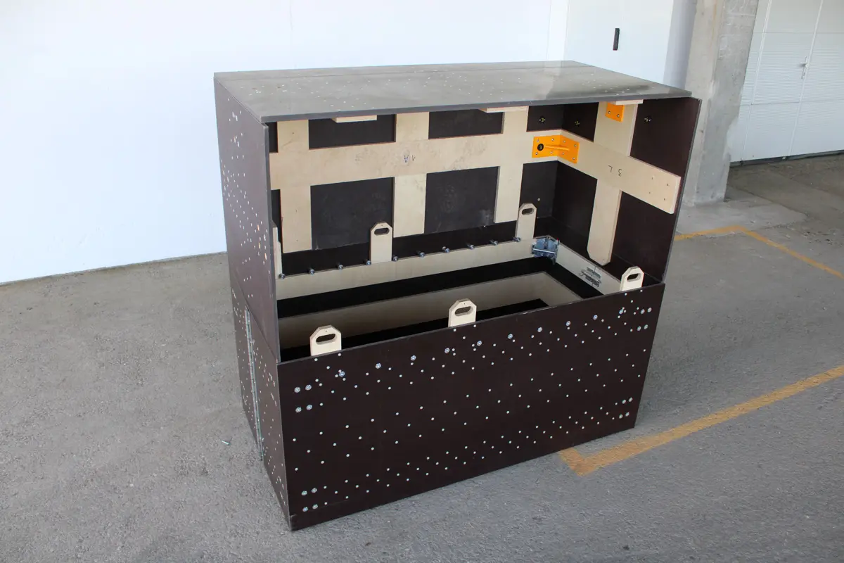 - 1x Klappbarer Verbaukasten (1600x750x750mm) aus 15mm Siebdruckplatten, verstärkt durch 18mm Multiplex Buche, verschraubt und verleimt