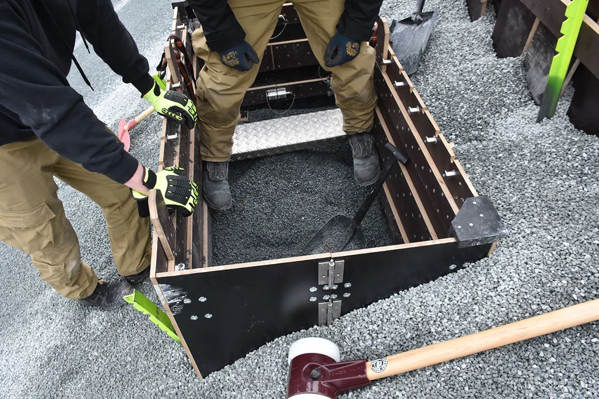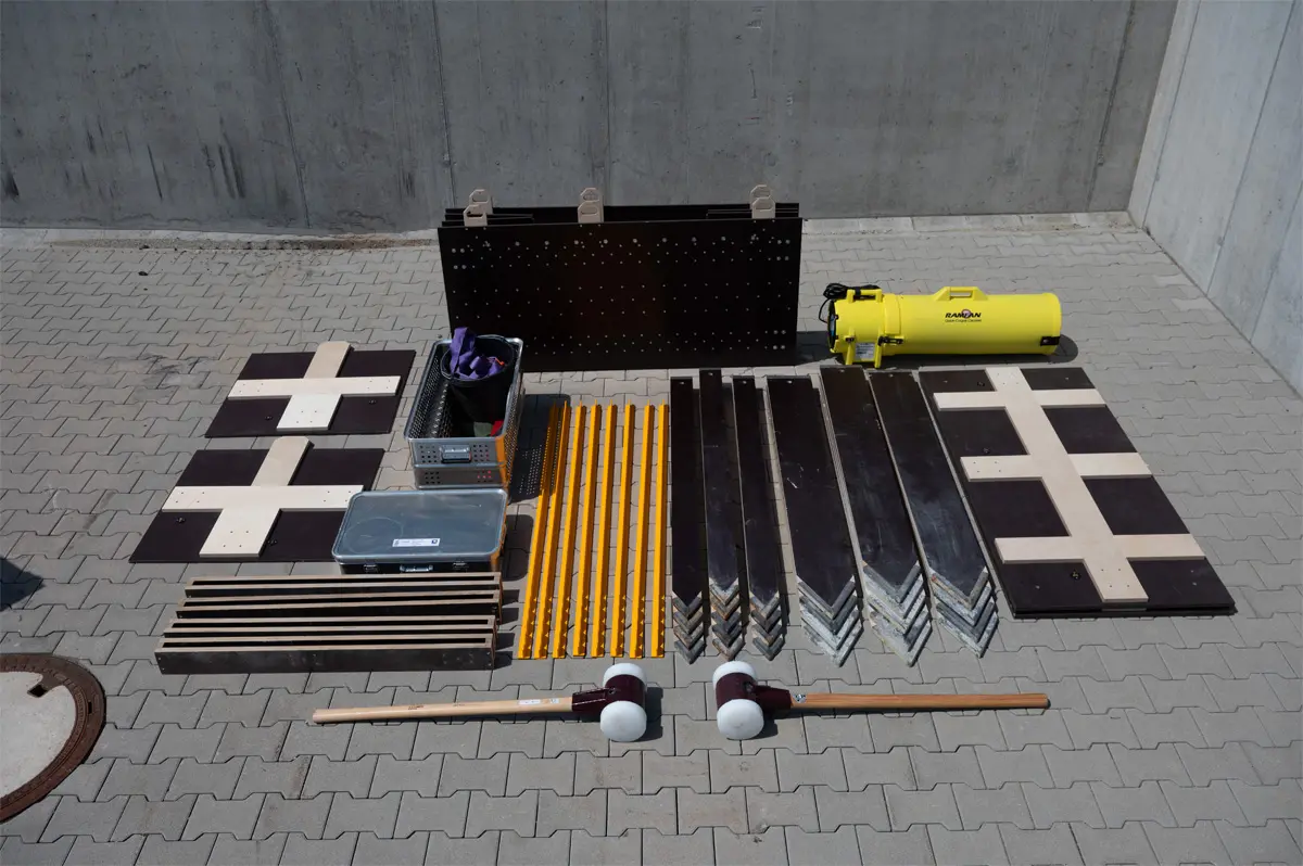 Zum sofortigen Einsatz wird der Verbau aufgeklappt und mit den eigens entwickelten Scharnieren gesichert. Mit einem Gewicht von ca. 60kg. kann der Verbau händisch, alternativ auch mittels Drehleiter oder Kran eingesetzt werden.