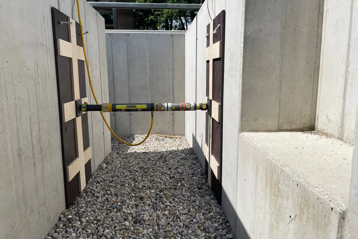 Insbesondere jedoch kann im Hang ein Spundwandsystem den gesamten Verbau sichern, so dass dieser nicht „wandert“. So genannte „T-Sprieße“ fixieren die Spundwand, den Verbau selbst und können als Widerlager eingesetzt werden.